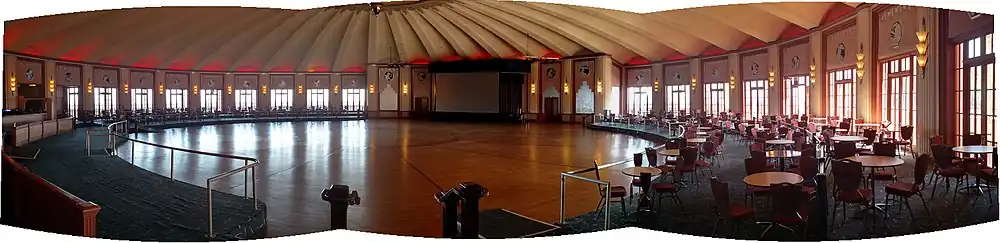 The upper-level houses the 20,000-square-foot Catalina Casino Ballroom. It is the world's largest circular ballroom, with a 180-foot (55 m) diameter dance floor that can accommodate 3,000 dancers.[1] French doors encircle the room connecting the dance floor with the Romance Promenade, an open balcony that runs around the building.