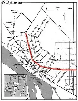 The General Services office compound of the US embassy is located there.[5] Also is the Financial Bank Tchad[6] and Nigerian embassy.[7] The west end of the avenue houses high walled villas where many expatriates live.[8]