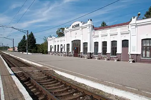 The railway station in Azov was opened on 6 December 1910. The first train arrived on the same day. The station handled many passenger trains until 1920s. Then began a period of decline as the number of trains decreased. In connection with the growth rate in Azov sea port, many freight trains started proceeding in state through the station.[1] Azov station was electrified AC in 1966. Objects of local cultural heritage on the station such as the terminus building, historic home, and warehouse were restored for the 100-years jubilee.[2][3]