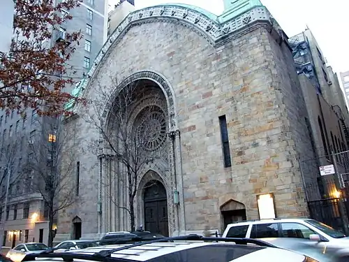 In 1864, the congregation moved yet again, to a new building on 34th Street,[2] the parcel later became part of the site of the flagship Macy's store. Driven by the rapid expansion of the city, they moved yet again in the spring of 1885 to Madison Avenue at 65th Street. That building was designed by Rafael Guastavino and Schwarzmann & Buchman.[16] Less than a year later, a fire did extensive damage to the building.[17] Reports rated the damage at $35,000.[18][19] B'nai Jeshurun was temporarily relocated to Congregation Ahawath Chesed, now Central Synagogue, on Lexington Avenue, which ironically had a fire of its own within the month, leaving both congregations homeless.[20]
