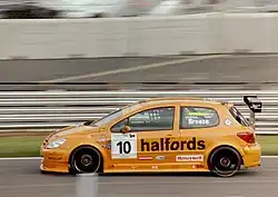 After two unsuccessful seasons of running the BTC-T Peugeot 406 Coupe, Team Halfords decided to switch to the Peugeot 307. Designed by renowned Formula One designer Sergio Rinland,[2] the 307 was the second BTC Touring spec car built by the Coventry-based firm. Two cars were built, and both appeared for the first rounds of 2003 at Mondello Park, initially driven by Dan Eaves and Carl Breeze, although Breeze was replaced by Daniel Buxton halfway through the season.[3] The 307 struggled at the start of the season,[4] but became slightly more competitive as the season went on, Eaves eventually finishing 4th in the Independents championship.[5] However, in 2004, Eaves moved to Team Dynamics, taking the Halfords sponsorship with him.[6]