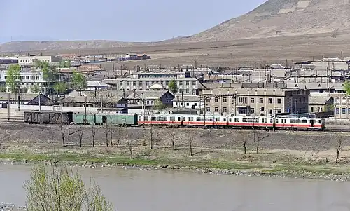 A Class GI trainset pulling a mixed train at Sambong on the Hambuk Line, North Korea.