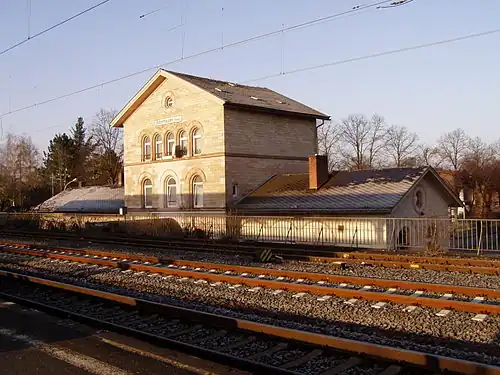 Babenhausen (officially: Babenhausen (Hess)) station is a junction station at the intersection of the Rhine-Main Railway (German: Rhine-Main-Bahn) and the Odenwald Railway (German: Odenwaldbahn) in the town of Babenhausen in the German state of Hesse.