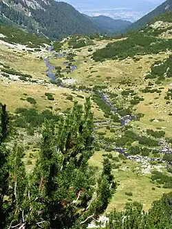 The river takes its source from the uppermost of the Banderishki Lakes, at an altitude of 2,310 m, situated in the Banderishki Cirque in northern Pirin. It initially flows to the northwest, catching the waters of the rest of lake group and the turns in northeastern direction. It flows at a high gradient of 100.77 m/km, which makes it turbulent, with many jumps and small waterfalls.[2] The highest waterfall is Banderishki Skok, reaching 11 m at an altitude of 1,700 m. Its surroundings were declared a protected area in 1965. The Banderitsa then reaches the homonymous mountain refuge and in the next two kilometers runs through rocky and narrow valley. Upon reaching the meadow Banderishka Polyana on the foothills of the summit of Kutelo (2,908 m), the river disappears underground and reemerges after 1.5 km. At 400 m southwest of the town of Bansko at an altitude of 1,063 m, the Banderitsa merges with the river Demyanitsa, forming the river Glazne.[2]
