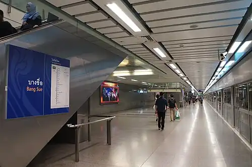 Bang Sue MRT station (Thai: สถานีบางซื่อ, pronounced [sā.tʰǎː.nīː bāːŋ sɯ̂ː]; code BL11) is a Bangkok MRT rapid transit station on the MRT Blue Line, located near Bang Sue Junction railway station, in Bangkok. It connects to SRT Dark Red Line and SRT Light Red Line at Krung Thep Aphiwat Central Terminal located above the station. Its symbol color is blue.