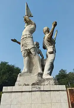 A palm-lined east–west avenue divides the main academic and administrative buildings to its north from mostly residential and recreational facilities to its south. At its east end is BAU's Shaheed Minar, memorializing those killed during the 1952 Bengali language movement.[7] Nearby is a 2000 sculpture by Shaymol Chowdhury of three standing figures called Bijoy '71. It pays tribute to the sacrifices made during the Bangladesh Liberation War.[18]