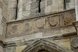 There are eleven heraldic shields on the north side of the Bargate.[32] Aside from the crosses of Saints George and Andrew, they are the coats of arms of leading families of the town from the end of the 17th century and early 18th.[33] The shields have repeatedly suffered from decay, due to damp.[34] The original shields largely decayed away by the early 19th century. They were replaced by shields made from Caen stone.[34] These shields were in turn damaged by damp and were heavily decayed by the start of the 20th century, at which point they were patched with mortar held together by iron.[34] These repairs again failed, and work was again carried out in the 1990s, but these repairs again decayed.[34] Another attempt to repair the shields is planned in the aftermath of the 2016 mortar replacement.[26]