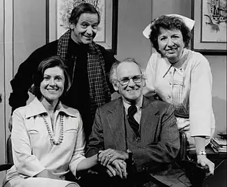 With cast of Doc. Standing, L–R: Irwin Corey and Mary Wickes. Seated: Elizabeth Wilson and Hughes (1975)
