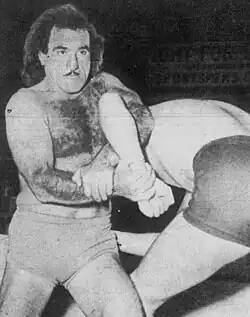In June, 1940, Leone began wrestling in Joe Turner's Washington, D.C., territory.[2] It was whilst wrestling here that the United States entered World War II. The U.S. was now at war with Leone's native Italy, which made him an instant heel. As an Italian citizen, Leone was exempt from being drafted into the military and as more and more wrestlers were drafted, it opened up new spots on cards for Leone as a top heel. He would become a headliner in DC, notably feuding in headline bouts against “Gentleman” Lou Plummer. Attendance rose steadily with Leone in the main event.[2] Memorably, he headlined one such event against Hans Kampfer, a German, where he worked as the heel. It is said that this match illustrated his abilities as a 'bad guy', having gotten boos from the fans in a match against a German during World War II.[2][1] Leone left the D.C. territory at the end of the war in 1945 and began wrestling throughout the East Coast. He briefly returned to Europe in 1947 before returning to the U.S. East Coast in 1948.[2]