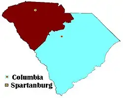 Barrett was tried in Columbia, asserted to be in the Eastern District of South Carolina (in blue), for crimes committed in Spartanburg, asserted to be in the Western District of South Carolina (in red).