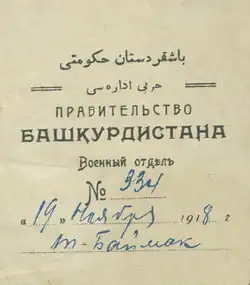 According to the farman of the Government of Bashkurdistan of June 12, 1918, the Bashkir Military Council was formed to control the Bashkir army.[5]