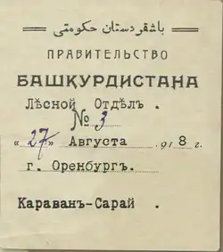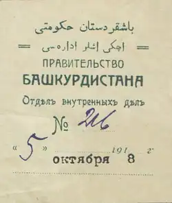 The local institutions of the Bashkir Government were the canton (district) and yurt (volost) boards, the formation of which began in the autumn of 1917. In relation to the Soviet power, the Bashkir Government initially took a waiting position. On the basis of the decision of the Orenburg Muslim Military Revolutionary Committee, on the night of February 15–16, 1918, 7 members of the Bashkir Government and the Bashkir Central Shuro (Ildarkhan Mutin, Allabirda Yagafarov, Sagit Mryasov, Akhmet-Zaki Validov, Galiakhmet Aitbaev, Abdulla Adigamov, Ildsa Adigamov, Isa Salikhov) were arrested. The resolution of the Muslim Military Revolutionary Committee on the arrest was approved by the Orenburg Provincial Revolutionary Committee only retroactively, which believed the libel of the workers of the Muslim Military Revolutionary Committee on the alleged joint actions of the Bashkir Government against the Soviet government with the ataman of the Orenburg Cossack Circle Alexander Dutov.[2][3] After the arrest of members of the Bashkir Government, a group of Bashkir youth, including some activists from the Tulkin youth organization, formed a new governing body – the Provisional Revolutionary Council (Shuro) of Bashkurdistan. In March 1918, in Baimak, the Bolsheviks shot two members of the Government of Bashkurdistan – Gabdulla Idelbaev and Gimran Magazov.[4] On April 4, members of the government under arrest were released during a joint raid by the Bashkirs and Cossacks.
