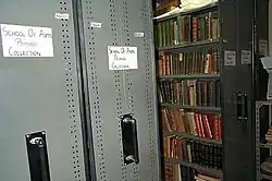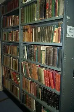 The Old Bathurst School of Arts Library Collection was probably begun soon after the establishment of the Bathurst School of Arts in 1855. In the financial year 1913–1914, the School of Arts Library Collection was measured at nearly 20,000 volumes.[5] In the 1940s at least the collection was still housed on the first floor of the 1862 School of Arts building on the corner of William and Howick Streets.[6] Bathurst City Council acquired the collection in 1956 when it took over the Old School of Arts building. The estimated 2,000 books now held in this collection were probably separated out from the Bathurst City Library's general holdings soon after acquisition, and stored together away from public access. They had never been available for lending, although they had been viewed by members of the public from time to time under supervision.[7][1]