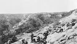 Baby 700 is a hill in the Sari Bair range, between Russell's Top and Battleship Hill. It was named after its supposed height above sea level, but its actual height was only 590 feet (180 m).[2] The Turkish name for the hill was Kilic Bayir.[3] The most direct route to there from the present ANZAC lines was a distance of 350 yards (320 m) from Russell's Top through The Nek, a twenty-yard (18 m) wide piece of high ground between Malone's Gully to the north and Monash Valley to the south.[4][5]