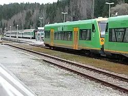 Bayerisch Eisenstein/Železná Ruda-Alžbětín station (German: Bahnhof Bayerisch Eisenstein, Czech: Nádraží Železná Ruda-Alžbětín) is a railway station on the border of southeast Germany and the Czech Republic. It forms the junction between the Bavarian Forest railway from Plattling to Bayerisch Eisenstein, which was started in 1874 by the Bavarian Eastern Railway Company (or Bavarian Ostbahn) and completed by the Royal Bavarian State Railways, and the Pilsen–Markt Eisenstein (today: Plzeň–Železná Ruda) railway built by the Pilsen–Priesen(–Komotau) railway in what was then Bohemia. The national border between Germany and the Czech Republic runs through the middle of the station building.