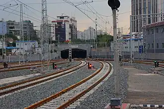 The Beijing underground cross-city railway is a short railway connection in Beijing. This railway line includes the Qiansanmen Tunnel. The speed limit is 120 km/h.[1] It connects the important transportation hubs Beijing railway station and Beijing West railway station via a tunnel. It also connects lines from southern and western areas with lines from northeast China.[3] The railway has a length span of 9.156 km (5.689 mi), and has been officially operational since March 20, 2015.[4]