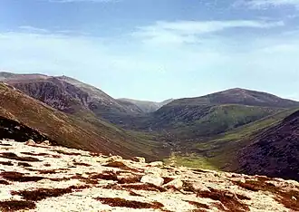 Beinn a' Chaorainn is a Scottish mountain in the heart of the Cairngorms range. It is quite a remote hill, being located roughly 19 kilometres south east of Aviemore and 14 kilometres north west of Braemar. The mountain stands on the border of the Moray and Aberdeenshire council areas. The hill's name used to be spelt as Beinn a' Chaoruinn,[2] but the spelling of the word caorunn (in genitive case here) was altered to caorann by the Gaelic Orthographic Convention's attempts to standardise spelling.