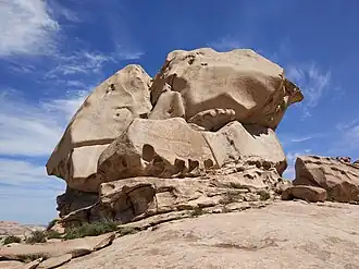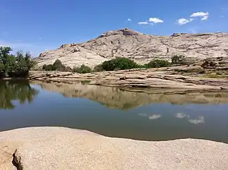 Bektauata is a small rocky range of moderate altitude located at the southern end of the Kazakh Upland system (Saryarka). The dry alluvial plain at the mouth of the Tokrau river lies to the east of the range. The nearest airport is Balkhash Airport.[2] There are rock formations, caves and rock pools in different spots of the Bektauata area. The largest cave is 48 meters (157 ft) in length. The inner part of the cave is full of water to a depth of 1.5 meters (4 ft 11 in).[1]