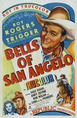 Bells of San Angelo is a 1947 American Trucolor Western film directed by William Witney and starring Roy Rogers. The first Roy Rogers film shot in Trucolor, this modern day Western mixes half a dozen songs with mystery, international smuggling of silver, violence, a pack of dogs and comedy relief with one character packing a "16-shooter" from which 22 shots can be heard during the musical number "Hot Lead" performed by the Sons of the Pioneers.