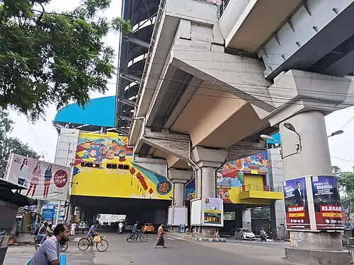 Bengal Chemical (also known as Wow Momo Bengal Chemical for sponsorship reason) is an elevated metro station on the East-West corridor of the Green Line of Kolkata Metro in Kolkata, West Bengal, India. It serves the Duttabad, Kankurgachi and Kadapara area. The structure is situated over EM Bypass, in front of Mani Square, whose linking footover bridge was left incomplete.