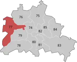 Berlin-Spandau – Charlottenburg North (German: Berlin-Spandau – Charlottenburg Nord) is an electoral constituency (German: Wahlkreis) represented in the Bundestag. It elects one member via first-past-the-post voting. Under the current constituency numbering system, it is designated as constituency 77. It is located in western Berlin, comprising the Spandau borough.[1]