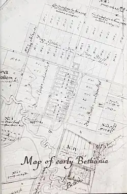 Bethania was founded June 12, 1759, by the Moravian Brethren of Wachovia as a congregational, agricultural, and trades community. Bethania was the first planned Moravian settlement in Wachovia, and members of a "Society", under the care of the Bethania congregation, were permitted to reside in the village after July 1759. Today, Bethania's eighteenth-century German-type linear agricultural village design remains visible and intact, and most town lots and roadways have remained in continuous use since 1759. The name "Bethania" is the German form of "Bethany", the name of a village near Jerusalem recorded in the New Testament as the home of Mary, Martha and Lazarus, as well as that of Simon the Leper.[6]