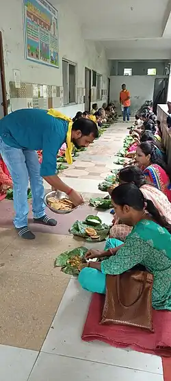 Bhandara service in Hinduism is the special free of cost meal, served to the devotees present in the Temple. Food is wholeheartedly cooked and served also to the needy devotees waiting in short distance to the Temple. Bhandara, a festive occasion as a part of thanksgiving the lord and service to people in Hinduism.[1]