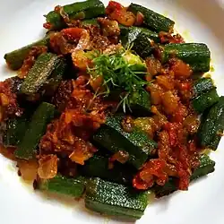 Bhindi Fry (also called okra fry, fry ochro, bhendi fry, bhindi masala or bharwan bhindi) is stir-fried okra (ladies' finger) that is slit and stuffed with spice mix such as garam masala and other locally available ground spices.