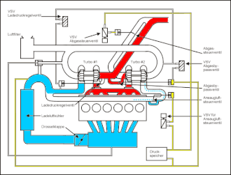 The system is arranged so that a small ("primary") turbocharger is active while the engine is operating at low RPM, which reduces the boost threshold (RPM at which effective boost is provided) and turbo lag. As RPM increases, a small amount of exhaust gas is fed to the larger ("secondary") turbocharger, to bring it up to operating speed. Then at high RPM, all of the exhaust gases are directed to the secondary turbocharger, so that it can provide the boost required by the engine at high RPM.[5]