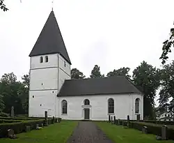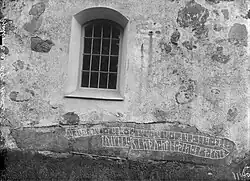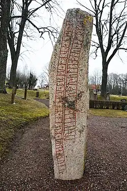 Östergötland Runic Inscription 64 or Ög 64 is the Rundata designation for a granite runestone that is 3.2 meters in height and which was originally found in the wall of the Bjälbo church. Before the historic significance of runestones was understood, they were often re-used as materials in the construction of roads, bridges, and buildings such as churches. The stone was removed from the wall, repaired, and raised in the churchyard in 1935 along with Ög 66. The inscription consists of runic text in the younger futhark that curves once to make two lines. The inscription is classified as being carved in runestone style RAK, which is the classification for runic text bands that have straight ends without any attached serpent or beast heads. There is nothing in the text or design of the inscription that identifies it as being a Christian memorial.[1] The inscription is signed by a runemaster named Lófi. No other surviving runestones have his signature.