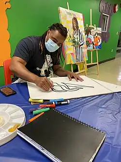 Kyng Rhodes ("B" artist) displays art during a 2021 Black History Month public program at The Children's Museum of Indianapolis.