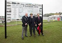 Blackbushe Airport 13 October 2012. Harold Bamberg (centre), Founder Chairman of Eagle Airways stands before the sign he has unveiled listing classic airliners and operators that flew from Blackbushe during its heyday at the heart of Britain's post-war independent airline industry. Names include Britavia, Continental, Dan-Air, Eagle Airways, Falcon, Orion and Pegasus.
