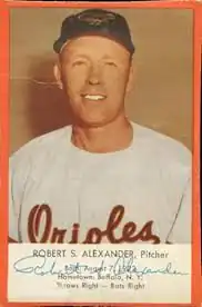 Robert Somerville Alexander (August 7, 1922 – April 7, 1993) was a Canadian professional baseball pitcher. He attended Bethany College in West Virginia. Alexander was signed by the New York Yankees in 1942. However, he did not make his Major League debut until 1955 with the Baltimore Orioles. He also played for the Cleveland Indians and the Toei Flyers of the Nippon Professional Baseball (NPB).