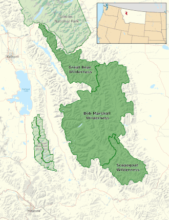 The Bob Marshall Wilderness Complex consists of three wilderness areas, all within the U.S. state of Montana, totalling over 1.5 million acres (6,100 km).[1] The largest wilderness area is the Bob Marshall Wilderness Area consisting of one million acres (4000 km). Adjoining the Bob Marshall to the north is the Great Bear Wilderness of 286,700 acres (1,160 km), and to the south of the Bob Marshall is the Scapegoat Wilderness consisting of 239,936 acres (971 km). An additional one million acres of roadless National Forest, private, and BLM land surrounds the designated wildernesses on all sides, for a total roadless area of 2.54 million acres.[2]