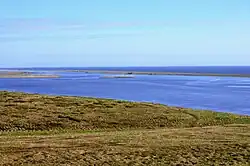 The river is 1–3 metres (3 ft 3 in – 9 ft 10 in) deep and up to 100 metres (330 ft) wide. It forms the Bolshaya Lake at its mouth.[6] At its mouth the Bolshaya is more than 0.5 miles (0.80 km) wide.[8] It flows in a generally-southwesterly direction to the coast, where it turns and flows in a south-southeast direction for about 10 miles (16 km) along the east side of a narrow sand-and-gravel spit before emptying into the Sea of Okhotsk at the end of the spit.[4] An 1870 account said that it received the river Apatcha above the town of Bolsheretsk[a] and then ran for 20 miles (32 km) to the Sea of Okhotsk. Large boats could navigate the river to within eight miles of the town.[5] According to the United States Hydrographic Office (1932):[9]