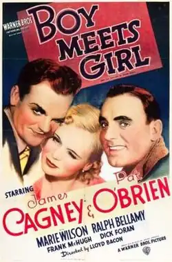 Boy Meets Girl is a 1938 American screwball comedy film directed by Lloyd Bacon and starring James Cagney and Pat O'Brien. The supporting cast features Marie Wilson, Ralph Bellamy, Frank McHugh, Dick Foran and Ronald Reagan.[1][2] The screenplay by Bella and Sam Spewack is based on their 1935 stage play of the same name,[3][4][5] which ran for 669 performances on Broadway.[6] The two zany screenwriters played by Cagney and O'Brien were based on Ben Hecht and Charles MacArthur, while Ralph Bellamy's part as the producer was based on Darryl Zanuck of 20th Century Fox.[7]