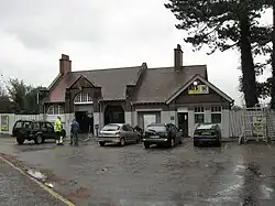 The station was a variation on the standard island platform design typical of the London Extension, and here it was the more common "cutting" type reached from a roadway (the A43), that crossed over the line. The cutting itself was substantial and typical of the line, involving the excavation of some 336,000 cubic yards (256,892 cubic metres) of material.[2] The original intention was for the station entrance to be located on the bridge itself, as it was at numerous other stations on the line, but local concerns about traffic congestion forced a change in the layout, the entrance being relocated at the top of the cutting on the west side in a lay-by off the road, with a footbridge leading across to the platform [3] (Hucknall Central had a similar arrangement, only there the entrance was on the east side). Although the town of Brackley had a population of barely 2,500 at the time, it was considered a sufficiently large and important settlement for the station to be provided with a more extensive range of platform buildings and facilities beneath a longer awning, as at Woodford Halse and Rugby Central.