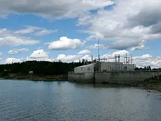 An unusual feature of this hydroelectric development, commissioned in 1965, is a pump system capable of lifting water from the reservoir into the 20-kilometre (12 mi) long canal leading to the power plant so that it can operate at low reservoir water levels.