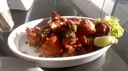 In Rio de Janeiro, São Paulo, Espírito Santo, and Minas Gerais, feijoada is popular, especially as a Wednesday or Saturday lunch. Also consumed frequently is picadinho (literally, diced meat) and rice and beans.[9][10] In Rio de Janeiro, besides the feijoada, a popular plate is any variation of grilled beef fillet, rice and beans, farofa, fried garlic and fried potatoes (batatas portuguesas), commonly called filé à Osvaldo Aranha. Seafood is very popular in coastal areas, as is roasted chicken (galeto). The strong Portuguese heritage also endowed the city with a taste for bolinhos de bacalhau (fried cod fritters), one of the most common street foods there.