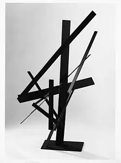 By 1956 he had started making abstract welded steel sculptures, one of the earliest British artists to do so. The use of welded steel in sculpture was unusual then, pioneered by Julio González and David Smith.[6] His early work consisted of geometrical pieces of steel, mostly rectangular plates and rods, welded into a whole. As his style evolved, the elements became more freely-placed into a dynamic construction.