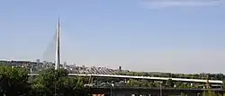 Ada Bridge (Мост на Ади) is a cable-stayed bridge which crosses the tip of Ada Ciganlija island, connecting the municipalities of Čukarica and New Belgrade. The bridge pylon is located on the tip of the island, which has been reinforced with large amounts of concrete and has been slightly enlarged to provide stronger foundations. Construction began in 2008, and the bridge was opened on 1 January 2012.[24][25] Component parts of the deck were manufactured in China and delivered in transportable units on a sea and river-route via Rotterdam through the Rhine–Main–Danube Canal to the pre-assembly yard next to the construction site at Mala Ciganlija in Belgrade.[26] The bridge is designed to significantly reduce traffic passing through the city center and the Gazela Bridge. It is planned to be part of the future Belgrade Inner City Semi-Ring Road.[27] It has three road lanes and a tram (light rail) track in each direction.[28] The bridge was featured in the fifth episode, season nine of the Discovery Channel documentary television series Build It Bigger.[29]