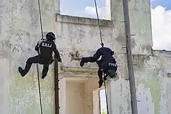 • Batalionul 2 Jandarmi Special Intervenție (2nd Gendarmes Battalion Special Intervention) - It is the operative structure of the Special Gendarmerie Intervention Brigade specialized in crisis management in the field of public order, ensuring public order and peace during the visits of official delegations and dignitaries, Romanians and foreigners, ensuring public order and peace during public events with high risk, in which the large public participates, the rescue-evacuation of persons, the intervention for the restoration of public order in case it has been seriously disturbed and riot police.