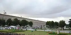 The Brindavan Gardens is a garden located 12 k.ms from the city of Mysore[1] in the Mandya District of the Indian State of Karnataka. It lies adjoining the Krishnarajasagara Dam which is built across the river Kaveri.[2] The work on laying out this garden was started in the year 1927 and completed in 1932.[3][4] Visited by close to 2 million tourists per year, the garden is one of the major attractions of Srirangapatna.[5] Sir Mirza Ismail, the Deewan of Mysore, a man with a penchant for gardens, founded the Brindavan Gardens (Krishnaraja Sagar Dam in particular) and built the Cauvery River high-level canal to irrigate 120,000 acres (490 km2) in modern Mandya district. The gardens were designed by German botanist and landscape designer Gustav Hermann Krumbiegel.