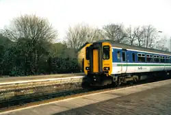 A First North Western Class 156 at Romiley station, near Manchester, in 2001. It is painted in its former Network NorthWest Regional Railways livery