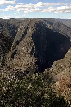 Bungonia National Park is notable for its unique geology which has given it a status as the "adventure capital of the Southern Tablelands".[2] The park contains over 200 caves and numerous gorges and canyons. The formations in Bungonia are part of the Lachlan Fold Belt which is made up of metamorphosed ordovician and devonian sandstones, shales and volcanic rocks.[6] The rock sequence in Bungonia is highly mineralised and part of a larger series of formations which contain gold deposits of economic importance to the region.