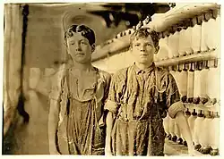 Lewis Hine (September 26, 1874, Oshkosh, Wisconsin – November 3, 1940) was an American sociologist and photographer. Hine used his camera as a tool for social reform. His photographs were instrumental in changing the child labor laws in the United States.[4] In 1908, he became the photographer for the National Child Labor Committee (NCLC), leaving his former teaching position. Over the next decade, Hine documented child labor in American industry to aid the NCLC's lobbying efforts to end the practice.[5] In 1909 he visited Burlington, and took photographs in Chace Mill. These demonstrate the employment practices where children with French Canadian names are seen to be working in responsible posts, and equally they provide images of the machines in use at the time. Mule spinning was relatively rare in the United States; where ring spinning predominated.