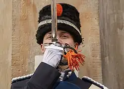 The historic busby is still worn by ceremonial detachments of the Dutch Hussars and Royal Gendarmerie (Koninklijke Marechaussee) in full dress uniform.[15]
