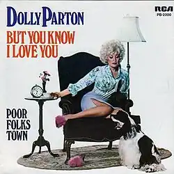 Country entertainer Dolly Parton (who, in 1983, would have the number 1 duet "Islands In The Stream" with Kenny Rogers) in 1980 included "But You Know I Love You", based on the occupation of on-the-road singer, on her album 9 to 5 and Odd Jobs. In March 1981, Parton released the song as the album's second single, following the success of "9 to 5," and it reached No. 1 on the Hot Country Singles chart on 20 June 1981, succeeding Rogers' accompanying Dottie West on "What Are We Doin' in Love" at the top slot.[4] Parton's version also crossed over, bowing at number 82 on 4 April 1981 and peaking at number 41 on 16 May 1981 on the Hot 100 and No. 14 on the AC chart.