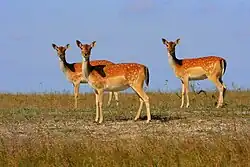 There are meadow, coastal water and sand-steppe landscapes. The flora includes about 700 species of plants. In the 1970s–1980s, on the area of 232 hectares, there were planted shelter forests, consisting of Elaeagnus angustifolia, Ulmus laevis, Robinia pseudoacacia and Fraxinus excelsior. It is a habitat for about a thousand acclimatized red deer, 2500 fallow deer, 90 onagers and several dozen domestic horses and moufflons; acclimatized birds are pheasants.