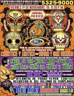 Consejo Mundial de Lucha Libre held its inaugural Día de Muertos show on October 31, 2014. As a promotion, children in costumes were admitted to the show for free.[1] CMLL held a second show on November 2, 2014. Both shows included CMLL's ring girls, known as Edcanes, and various wrestlers dressed in traditional Día de Muertos garb. CMLL also held a haunted house attraction in the basement of Arena México before each show.[2] CMLL has held shows to celebrate the holiday annually since 2014, making 2019 the sixth year.[3][4]
